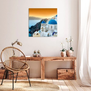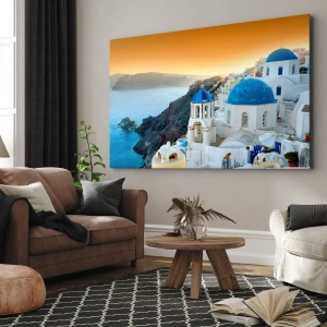 Bild auf Leinwand - Leinwandbild - Blick auf Santorini mit weißen Gebäuden und blauem Meer - 50x70cm - Santorini - an die Felsen gekuschelt - Moderne Wanddekoration für Wohnzimmer und Schlafzimmer ARTTOR