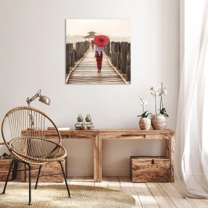Bild auf Leinwand - Leinwandbild - Eine Frau mit einem roten Regenschirm auf einer Holzbrücke - 50x70cm - Auf der alten Brücke - Moderne Wanddekoration für Wohnzimmer und Schlafzimmer ARTTOR