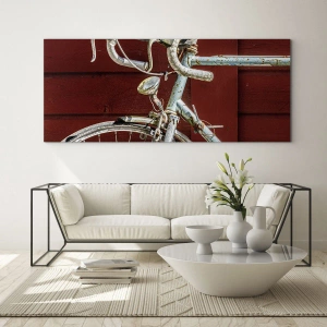 Glasbild - Bild auf glas - Ein altes Rennrad aus den 1970er Jahren vor einer roten Holzwand - 70x50cm - Geschaffen um zu siegen - Moderne Wanddekoration für Wohnzimmer und Schlafzimmer ARTTOR
