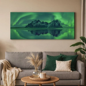 „Nordlichter über den Bergen“ ist ein außergewöhnliches Gemälde auf Leinwand im Querformat 70 x 50 cm, das den Betrachter in die magische Welt der nördlichen Natur entführt. Berge, umgeben von Polarlichtern in Grüntönen, spiegeln sich in der ruhigen Wasseroberfläche und schaffen eine harmonische und faszinierende Komposition.