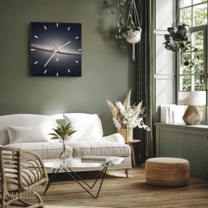 Die Uhr besteht aus 4 mm dickem Sicherheitsglas Glas. Die Herstellungstechnologie der Uhr entspricht der Sicherheitsklasse 2B2 gemäß der Norm PN-EN 12600: 2004, die Stoßfestigkeit garantiert. Die Uhr auf dem Glas ist bereit zu hängen - es hat einen Metallanhänger, einen Anhänger auf der Rückseite der Uhr und einen Schaumstoffabstand, der einen gleichmäßigen Abstand zwischen der Uhr und der Wand reguliert. Die Uhr hat einen geräuschlosen Schwimmmechanismus, der von einer 1,5-V-Batterie betrieben wird - AA-Batterie inbegriffen).
