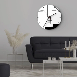 Die Uhr besteht aus 4 mm dickem Sicherheitsglas Glas. Die Herstellungstechnologie der Uhr entspricht der Sicherheitsklasse 2B2 gemäß der Norm PN-EN 12600: 2004, die Stoßfestigkeit garantiert. Die Uhr auf dem Glas ist bereit zu hängen - es hat einen Metallanhänger, einen Anhänger auf der Rückseite der Uhr und einen Schaumstoffabstand, der einen gleichmäßigen Abstand zwischen der Uhr und der Wand reguliert. Die Uhr hat einen geräuschlosen Schwimmmechanismus, der von einer 1,5-V-Batterie betrieben wird - AA-Batterie inbegriffen).