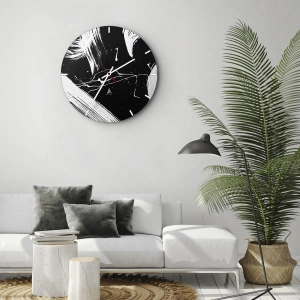 Die Uhr besteht aus 4 mm dickem Sicherheitsglas Glas. Die Herstellungstechnologie der Uhr entspricht der Sicherheitsklasse 2B2 gemäß der Norm PN-EN 12600: 2004, die Stoßfestigkeit garantiert. Die Uhr auf dem Glas ist bereit zu hängen - es hat einen Metallanhänger, einen Anhänger auf der Rückseite der Uhr und einen Schaumstoffabstand, der einen gleichmäßigen Abstand zwischen der Uhr und der Wand reguliert. Die Uhr hat einen geräuschlosen Schwimmmechanismus, der von einer 1,5-V-Batterie betrieben wird - AA-Batterie inbegriffen).
