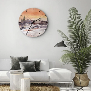 - Diese 30 x 30 cm große Wanduhr zeigt eine Aquarellillustration eines Schlosses am Flussufer, das vom warmen Licht der untergehenden Sonne erleuchtet wird. Eine perfekte Dekoration für romantische und klassische Innenräume.