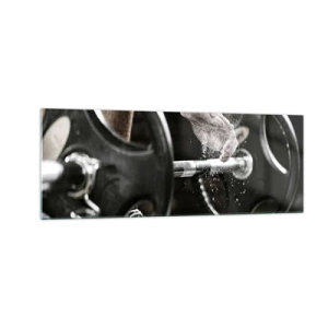 Glasbild - Bild auf glas - Hanteln und die Hände eines Sportlers bereiten sich auf das Training vor - 140x50cm - Herausforderung angenommen! - Moderne Wanddekoration für Wohnzimmer und Schlafzimmer ARTTOR
