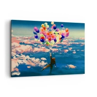 Bild auf Leinwand - Leinwandbild - Eine Figur mit Luftballons vor einem Hintergrund wirbelnder, bunter Wolken - 100x70cm - Zum blauen Wind - Moderne Wanddekoration für Wohnzimmer und Schlafzimmer ARTTOR
