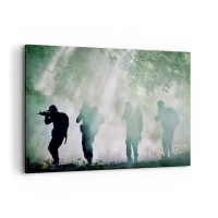 Bild auf Leinwand - Leinwandbild - Silhouetten von Soldaten in einem Wald, umgeben von Nebel - 120x80cm - Einer für alle… - Moderne Wanddekoration für Wohnzimmer und Schlafzimmer ARTTOR