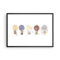 Poster in einem schwarzem Rahmen - Niedliche Tiere in Luftballons auf weißem Hintergrund - 70x50cm - Freunde auf Reise - Moderne Wanddekoration für Wohnzimmer und Schlafzimmer ARTTOR