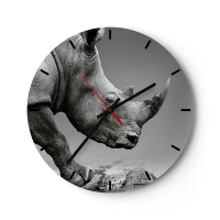 Wanduhr - Glasuhr - Ein Nashorn im Schwarz-Weiß-Stil auf neutralem Hintergrund - 30x30cm - Unaufhaltsame Stärke - Moderne Wanddekoration für Wohnzimmer, Küche und Schlafzimmer ARTTOR