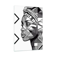 Glasbild - Bild auf glas - Schwarz-weißes ethnisches Porträt einer Frau mit geometrischen Mustern - 50x70cm - Ethnisches Porträt - Moderne Wanddekoration für Wohnzimmer und Schlafzimmer ARTTOR