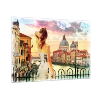 Glasbild - Bild auf glas - Eine Frau bewundert den Blick auf Venedig bei Sonnenuntergang. - 100x70cm - Als Abenteuer nur in ... - Moderne Wanddekoration für Wohnzimmer und Schlafzimmer ARTTOR