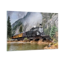 Glasbild - Bild auf glas - Eine Dampflokomotive auf einer Brücke in den Bergen - 120x80cm - Wo willst du hin? Wohin? - Moderne Wanddekoration für Wohnzimmer und Schlafzimmer ARTTOR