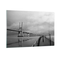 Glasbild - Bild auf glas - Eine Brücke in einer monochromen Landschaft mit einem Radfahrer - 120x80cm - Jedem das Verdiente - Moderne Wanddekoration für Wohnzimmer und Schlafzimmer ARTTOR
