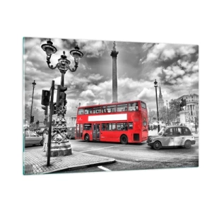 Glasbild - Bild auf glas - Ein roter Bus vor einer schwarz-weißen Stadtlandschaft - 120x80cm - Der wahre Blutkreislauf der Stadt - Moderne Wanddekoration für Wohnzimmer und Schlafzimmer ARTTOR