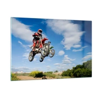 Glasbild - Bild auf glas - Ein Motorradrennfahrer im Flug vor blauem Himmel - 120x80cm - Himmelssprung - Moderne Wanddekoration für Wohnzimmer und Schlafzimmer ARTTOR