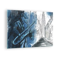 Glasbild - Bild auf glas - Jazz-Saxophonist in blau getönter urbaner Umgebung - 70x50cm - Urbane Rhapsodie - Moderne Wanddekoration für Wohnzimmer und Schlafzimmer ARTTOR
