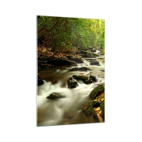 Glasbild - Bild auf glas - Ein Waldbach, der zwischen Steinen fließt, umgeben von Grün - 80x120cm - Wie flüssiges Silber - Moderne Wanddekoration für Wohnzimmer und Schlafzimmer ARTTOR