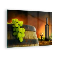 Glasbild - Bild auf glas - Trauben auf einem Fass in rustikalem Ambiente mit Wein im Hintergrund - 70x50cm - Stillleben mit einer Flasche Wein und einer Weintraube - Moderne Wanddekoration für Wohnzimmer und Schlafzimmer ARTTOR