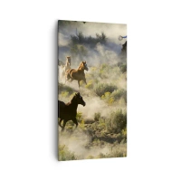 Bild auf Leinwand - Leinwandbild - Eine Herde wilder Pferde galoppiert durch Staub und Vegetation - 80x120cm - Rivalität – Freiheit oder männliche Stärke? - Moderne Wanddekoration für Wohnzimmer und Schlafzimmer ARTTOR