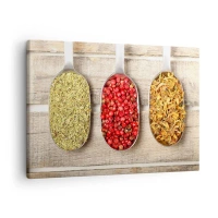 Bild auf Leinwand - Leinwandbild - Drei Metalllöffel mit Gewürzen auf einem hölzernen Hintergrund - 120x80cm - Küchenzauber - Moderne Wanddekoration für Wohnzimmer und Schlafzimmer ARTTOR