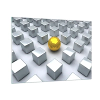Glasbild - Bild auf glas - Eine goldene Kugel, umgeben von silbernen Würfeln - 100x70cm - Warum ich? Geometrische Zusammensetzung - Moderne Wanddekoration für Wohnzimmer und Schlafzimmer ARTTOR
