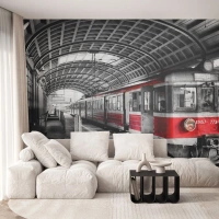 Fototapete Standard Eco - Ein roter Zug auf einem Bahnsteig in einer Industrieumgebung - 100x70cm - Vielleicht ist es eine Reise Ihres Lebens? - Moderne Wanddekoration für Wohnzimmer und Schlafzimmer ARTTOR