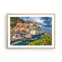Bild auf Leinwand - Leinwandbild - Bunte Häuser auf einer Klippe mit Blick auf das Meer in Cinque Terre - 70x100cm - Eine Gruppe umarmt die Felsen - Moderne Wanddekoration für Wohnzimmer und Schlafzimmer ARTTOR