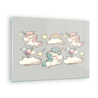 Glasbild - Bild auf glas - Niedliche Einhörner in den Wolken mit einem Regenbogen und Luftballons - 70x50cm - Sicherlich gibt es... - Moderne Wanddekoration für Wohnzimmer und Schlafzimmer ARTTOR