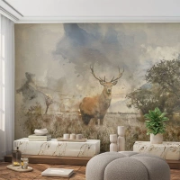 Fototapete Premium Sand - Ein stattlicher Hirsch auf einer Wiese im künstlerischen Aquarellstil - 100x70cm - Würde – Stärke – Würde - Moderne Wanddekoration für Wohnzimmer und Schlafzimmer ARTTOR