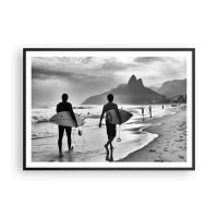 Poster in einem schwarzem Rahmen - Zwei Surfer laufen mit ihren schwarz-weißen Brettern am Strand entlang. - 100x70cm - Single-Wave-Samba - Moderne Wanddekoration für Wohnzimmer und Schlafzimmer ARTTOR