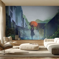 Fototapete Standard Eco - Eine Frau mit einem Regenschirm in einer verlassenen Stadt - 100x70cm - Belebender Regen - Moderne Wanddekoration für Wohnzimmer und Schlafzimmer ARTTOR