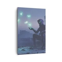 Bild auf Leinwand - Leinwandbild - Eine vermummte Figur mit magischen Vögeln im Hintergrund einer Stadt - 80x120cm - Das Leben wird zurückkommen - Moderne Wanddekoration für Wohnzimmer und Schlafzimmer ARTTOR