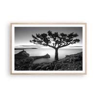 Poster - Schwarz-weiße Landschaft mit einem einsamen Baum auf einer Klippe über dem Meer - 100x70cm - Stille bis zum Horizont - Moderne Wanddekoration für Wohnzimmer und Schlafzimmer ARTTOR