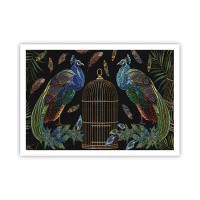 Poster - Pfauen neben einem goldenen Käfig auf schwarzem Hintergrund - 100x70cm - In königlichen Gewändern - Moderne Wanddekoration für Wohnzimmer und Schlafzimmer ARTTOR