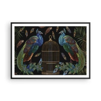 Poster in einem schwarzem Rahmen - Pfauen neben einem goldenen Käfig auf schwarzem Hintergrund - 100x70cm - In königlichen Gewändern - Moderne Wanddekoration für Wohnzimmer und Schlafzimmer ARTTOR
