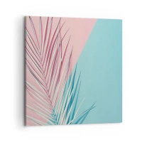 Bild auf Leinwand - Leinwandbild - Tropisches Blatt vor einem Hintergrund in Pastelltönen von Rosa und Blau - 70x100cm - Tropischer Eindruck - Moderne Wanddekoration für Wohnzimmer und Schlafzimmer ARTTOR
