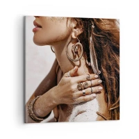 Glasbild - Bild auf glas - Stilvolle Frau mit Schmuck vor hellem Sandhintergrund - 70x100cm - Königin des wilden Strandes - Moderne Wanddekoration für Wohnzimmer und Schlafzimmer ARTTOR
