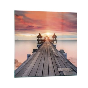 Glasbild - Bild auf glas - Holzsteg führt zu Pavillons bei Sonnenuntergang - 70x100cm - Westen im Osten - Moderne Wanddekoration für Wohnzimmer und Schlafzimmer ARTTOR