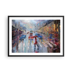 Poster in einem schwarzem Rahmen - Eine Frau mit einem Regenschirm auf einer verregneten Straße im Neonlicht. - 70x50cm - Regnerischer Nachmittag in der Stadt - Moderne Wanddekoration für Wohnzimmer und Schlafzimmer ARTTOR