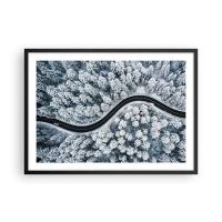 Poster in einem schwarzem Rahmen - Eine Vogelperspektive auf eine kurvenreiche Straße in einem Winterwald - 70x50cm - Durch den Winterwald - Moderne Wanddekoration für Wohnzimmer und Schlafzimmer ARTTOR