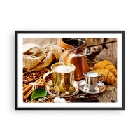 Poster in einem schwarzem Rahmen - Eine goldene Tasse Kaffee, umgeben von Bohnen, Krügen und Croissants - 70x50cm - Schönen Tag noch! - Moderne Wanddekoration für Wohnzimmer und Schlafzimmer ARTTOR