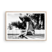Poster in einem schwarzem Rahmen - Frau mit Hut am Pool in Schwarz und Weiß - 100x70cm - Sommertraum - Moderne Wanddekoration für Wohnzimmer und Schlafzimmer ARTTOR