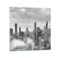 Wanduhr - Glasuhr - Schwarz-weißes Stadtpanorama mit Wolkenkratzern und Nebel - 30x30cm - Amerikanische Landschaft - Moderne Wanddekoration für Wohnzimmer, Küche und Schlafzimmer ARTTOR