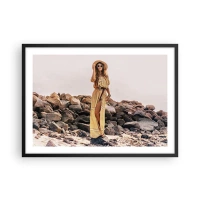 Poster in einem schwarzem Rahmen - Eine Frau im Boho-Stil vor einem felsigen Strandhintergrund - 70x50cm - Die Magie der Steine - Moderne Wanddekoration für Wohnzimmer und Schlafzimmer ARTTOR