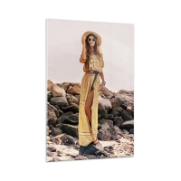 Glasbild - Bild auf glas - Eine Frau im Boho-Stil vor einem felsigen Strandhintergrund - 80x120cm - Die Magie der Steine - Moderne Wanddekoration für Wohnzimmer und Schlafzimmer ARTTOR