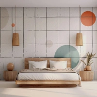 Fototapete Standard Eco - Farbige Kreise auf einem Hintergrund aus einem Raster aus dünnen schwarzen Linien - 100x70cm - Gefangen. Wir oder sie? - Moderne Wanddekoration für Wohnzimmer und Schlafzimmer ARTTOR