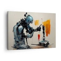 Fototapete Premium Canvas - Roboter bei der Arbeit mit abstraktem Hintergrund - 100x70cm - Schon morgen… - Moderne Wanddekoration für Wohnzimmer und Schlafzimmer ARTTOR