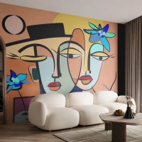 Fototapete Standard Eco - Abstrakte Gesichter im kubistischen Stil mit Blumen - 100x70cm - Picassos randez vous - Moderne Wanddekoration für Wohnzimmer und Schlafzimmer ARTTOR