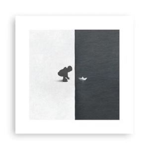 Poster - Eine Kinderfigur mit einem Papierboot vor einem Hintergrund aus kontrastierenden Hälften - 100x70cm - Tolle Expedition - Moderne Wanddekoration für Wohnzimmer und Schlafzimmer ARTTOR
