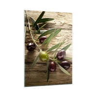Glasbild - Bild auf glas - Olivenzweig auf einem hölzernen Hintergrund - 50x70cm - Direkt aus der Natur - Moderne Wanddekoration für Wohnzimmer und Schlafzimmer ARTTOR
